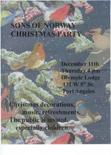 The market takes place from 10 am to 2pm in downtown Port Angeles at the outdoor Gateway Center located at the intersection of Front and Lincoln Streets. We will have lefse, kringle and other seasonal baked goods. Weather permitting, we will also feature Scandinavian greeting cards and gift wrap by our lodge artist. |