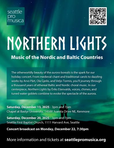 Northern Lights - Music of the Nordic and Baltic CountriesClick here for more information Seattle Pro Musica: From medieval chant and traditional carols to dazzling works by Arvo Part, Ola Gjeilo, and Veljo Tormis, you will journey through a thousand years of ethereal Baltic and Nordic choral music. In our centerpiece, Northern Lights by Eriks Esenvalds, voices, chimes, and tuned water goblets combine to evoke the spectacle of the aurora.